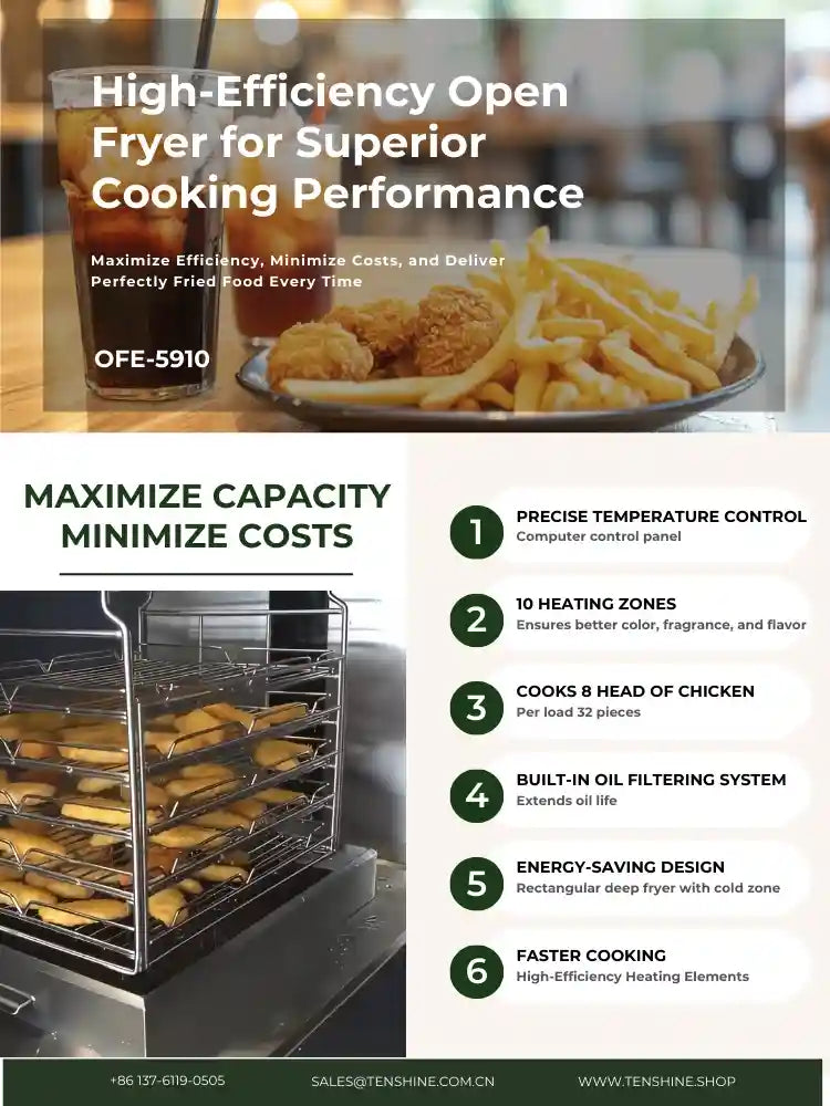 Presentamos la freidora eléctrica elevable abierta TENSHINE serie TFS-OFE5910 de 8 piezas: una solución de alto rendimiento para cocinas con gran volumen de producción. Esta innovadora unidad es un sistema de aceite de freidora de vanguardia que garantiza una rápida recuperación de la temperatura, lo que la convierte en una freidora comercial ideal y una de las mejores opciones para la venta.