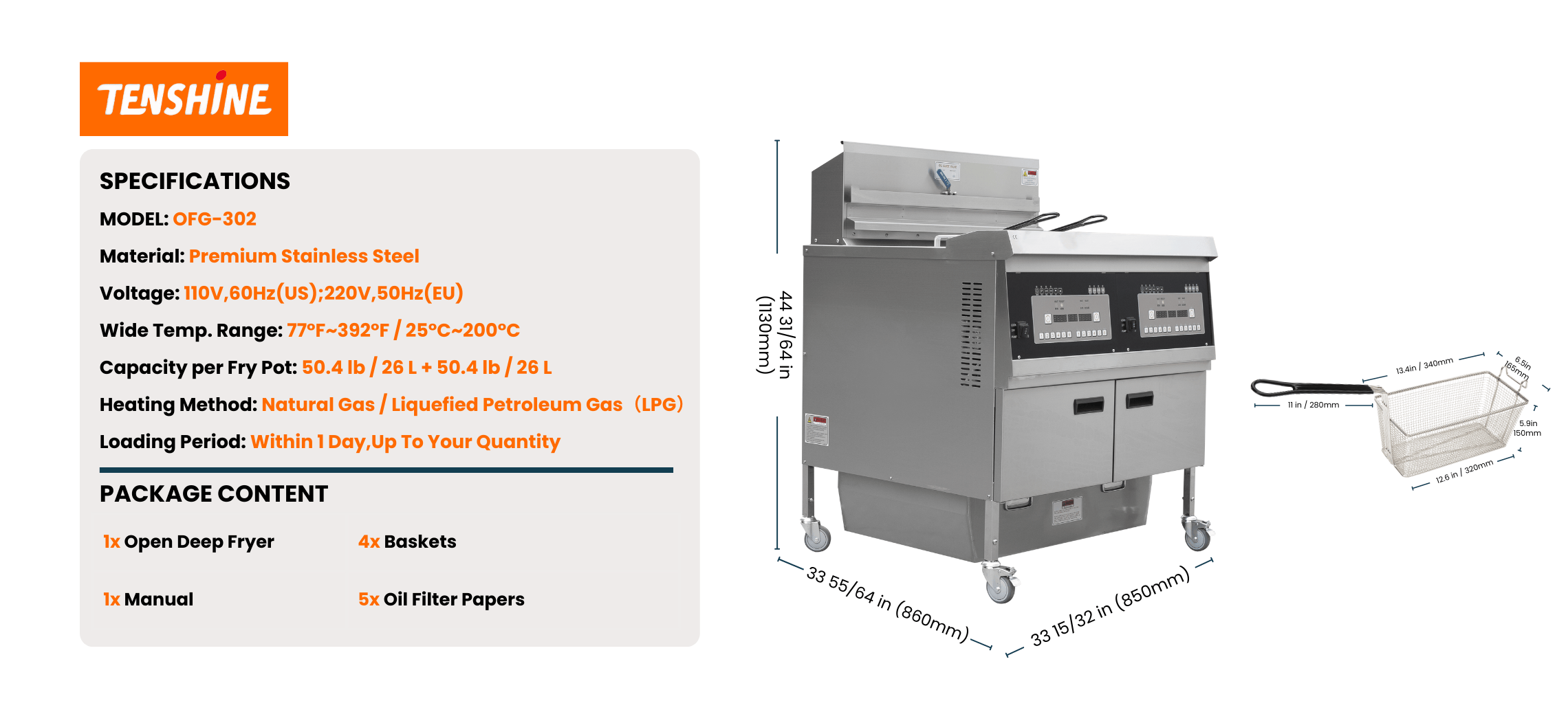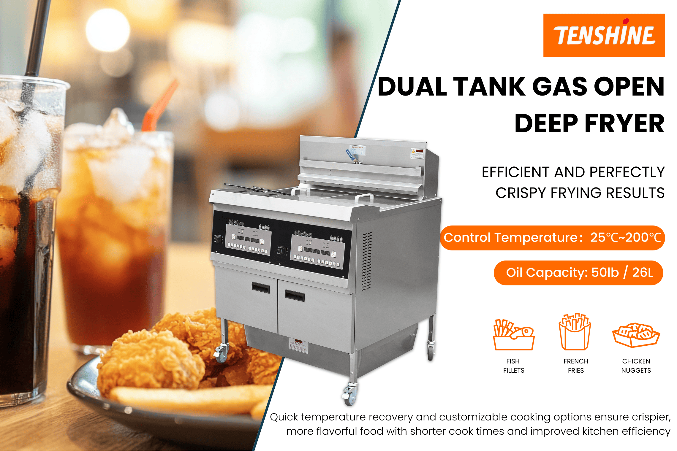 Dual Tank Gas Open Deep Fryer with Oil Filtration System and Programmable Controls OFG-302 TENSHINE