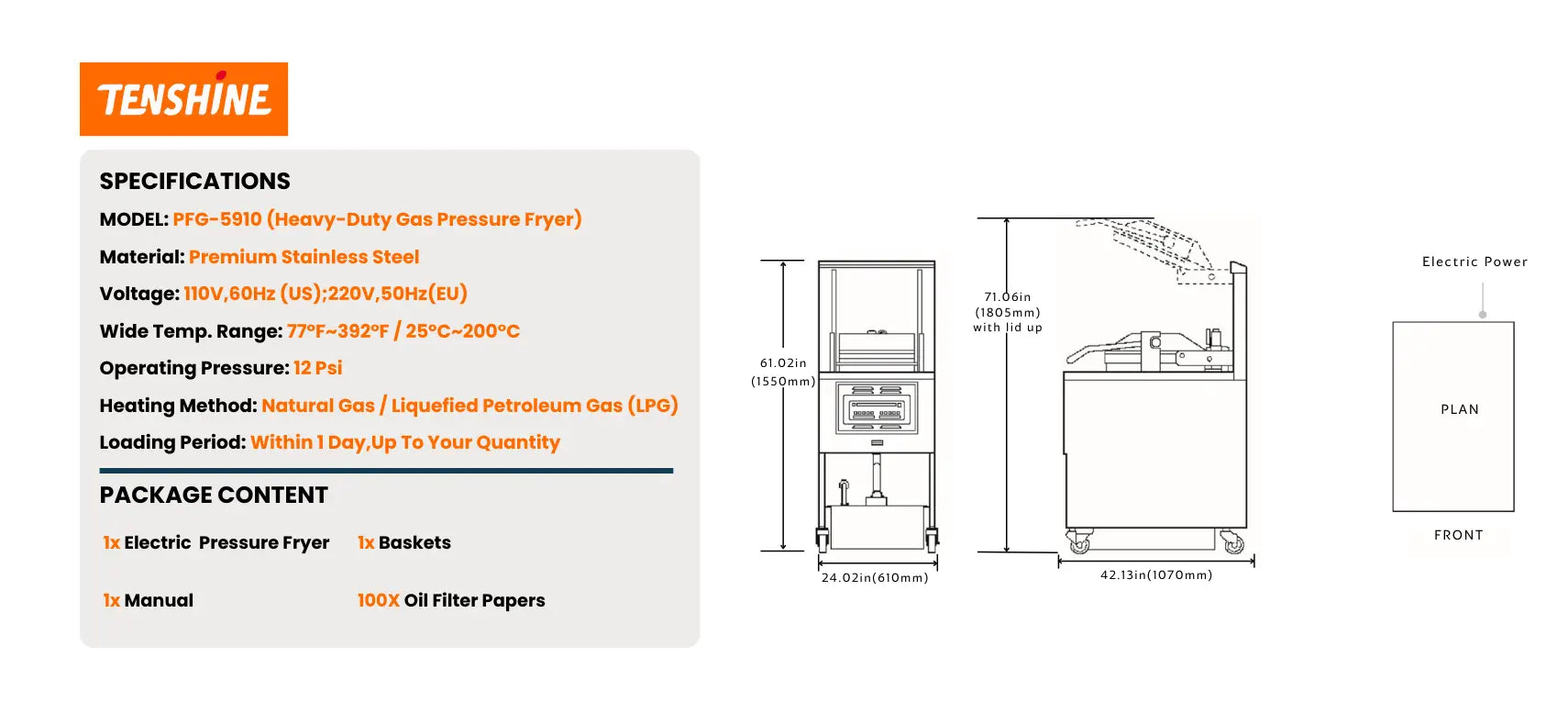 The TENSHINE PFG-5910 is an advanced commercial pressure fryer designed to handle the demands of high-volume cooking.